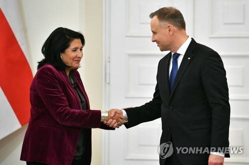 epa10349575 Polish President Andrzej Duda (R) and Georgian President Salome Zourabichvili (L) during a press conference after their meeting at the Presidential Palace in Warsaw, Poland, 05 December 2022. EPA/RADEK PIETRUSZKA POLAND OUT