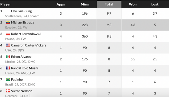 축구 통계 사이트 '후스코어드닷컴'에서 집계한 통계에 따르면,?사실상 카타르 상공은 조규성의 것이다. 포르투갈전에서 조규성은 무려 10개의 공중볼 경합 시도 중 9번을 성공하며 압도적인 성공률을 자랑했다. 가나전은 12번의 시도 중 6번을 성공, 교체로 출전한 우루과이전엔 7회 시도해 3회를 성공했다.