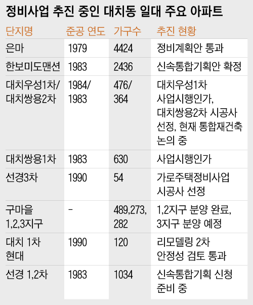 다른 단지들도 사업에 속도를 내기 시작했다. 이미 사업시행인가를 받은 대치우성1차는 인근 대치쌍용2차와 통합 재건축 추진에 나섰다. 선경1∙2차도 신속통합기획안 신청을 준비 중인 것으로 알려졌다. 은마아파트 맞은편 구마을1·2지구는 각각 대치푸르지오써밋과 르엘 대치로 이미 분양까지 마쳤다. 남은 3지구는 ‘디에이치 에델루이’로 이르면 이달 중 분양한다.