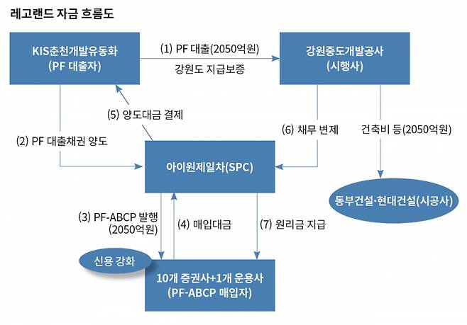 (1) 레고랜드 시행사인 강원중도개발공사(이하 시행사)는 KIS춘천개발유동화(PF 대출자)라는 회사로부터 레고랜드 건설을 위한 자금 2050억원을 빌리기로 한다(PF 대출). 시공사(동부건설·현대건설)가 레고랜드 건설에 필요한 건축비 등으로 사용할 수 있도록 하기 위해서다. 강원도는 혹시라도 시행사가 돈을 갚지 못할 경우, 도(道)가 대신 갚을 것이라며 지급보증을 섰다. PF 대출자는 강원도를 믿고 안심하며 자금을 대출해주었다. 시행사는 이후 레고랜드에서 벌어들이는 돈으로 이 대출금을 갚아나가면 될 것이다.