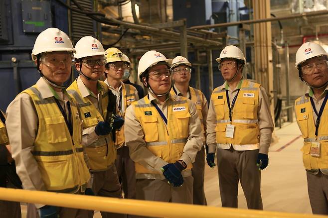 [정승일(오른쪽 네 번째) 한국전력 사장이 지난 3~5일 아랍에미리트(UAE) 바라카원전 건설 현장을 방문해 주요시설을 점검하고 있다. (사진=한국전력 제공)]