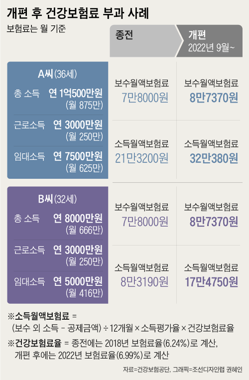 다음 표는 건강보험 부과 제도 개편 이후 직장가입자가 내야하는 건보료 부과 사례다. 근로소득 3000만원인 B씨가 임대소득으로 5000만원을 벌었다면, 9월 제도 개편 이전 기준으로 내야할 총 보험료는 월 16만1190원이었지만 지금은 63% 늘어난 26만2120원을 내야 한다.