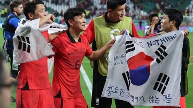 당시 축구 국가대표 선수들이 '중요한 건 꺾이지 않는 마음'이라고 적힌 태극기를 들고 환호하는 모습이 카메라에 잡혀 화제를 모았습니다.