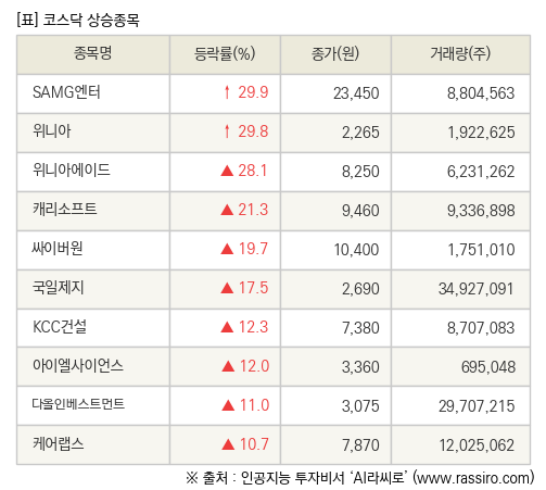 [fnRASSI]장마감, 코스닥 상승 종목(SAMG엔터 29.9% ↑)
