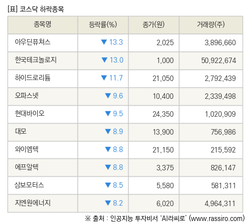 [fnRASSI]장마감, 코스닥 하락 종목(아우딘퓨쳐스 -13.3% ↓)