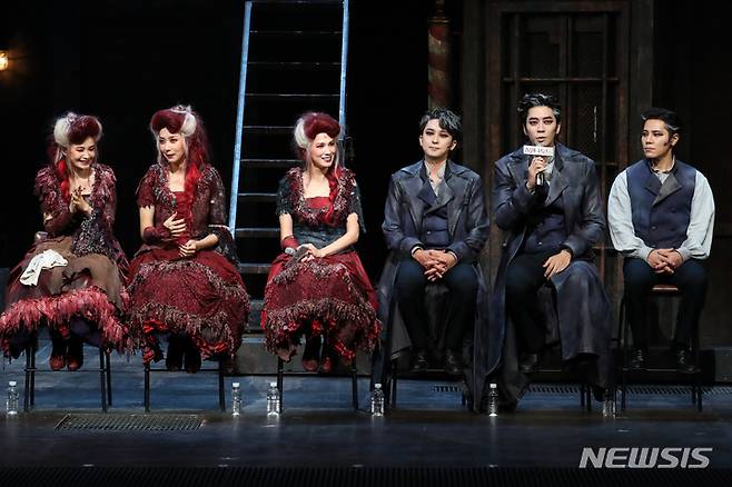 [서울=뉴시스] 박진희 기자 = 뮤지컬 '스위니토드' 스위니토드 역의 배우 강필석, 신성록, 이규형, 러빗 부인 역의 배우 전미도, 김지연, 린아가 6일 서울 송파구 샤롯데씨어터에서 언론 시연회를 마치고 기자간담회를 하고 있다. 2022.12.06. pak7130@newsis.com