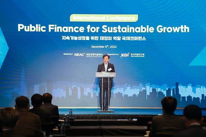 [이인호 국민경제자문회의 부의장이 오늘(6일) 서울 페어몬트 호텔에서 열린 '지속가능성장을 위한 재정의 역할' 국제 콘퍼런스에서 개회사를 하고 있다. (KDI 제공=연합뉴스)]