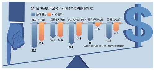 원화 기준 코스피는 올해 들어 18.2% 하락하는 데 그쳤다. 이는 G20에서는 러시아 다음으로 하락폭이 큰 것이지만 달러 환산 수치보다는 7%포인트 덜 하락했다. 이어 각국 통화 기준으로 미국(-14.6%), 중국(-13.3%), 이탈리아(-10%), 독일(-8.5%) 주요 지수의 하락폭이 큰 것으로 나타났다. 하지만 달러 환산보다는 중국이 8.2%포인트, 이탈리아가 7.1%포인트 , 독일은 7.3%포인트 덜 하락했다. 아시아에서는 각국 통화 기준 인도(7.9%), 인도네시아(6.7%)의 올해 주가 지수가 상승한 것으로 나왔고, 통화 완화 정책을 고수하는 일본(-3.4%)도 선방했다.