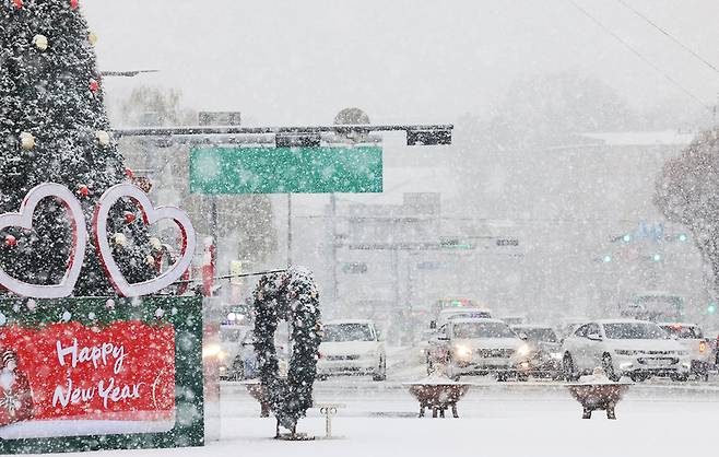 [눈이 내린 오늘(6일) 오전 경기도 수원시 화성행궁 앞 도로에서 차량이 서행하고 있다. (사진=연합뉴스)]