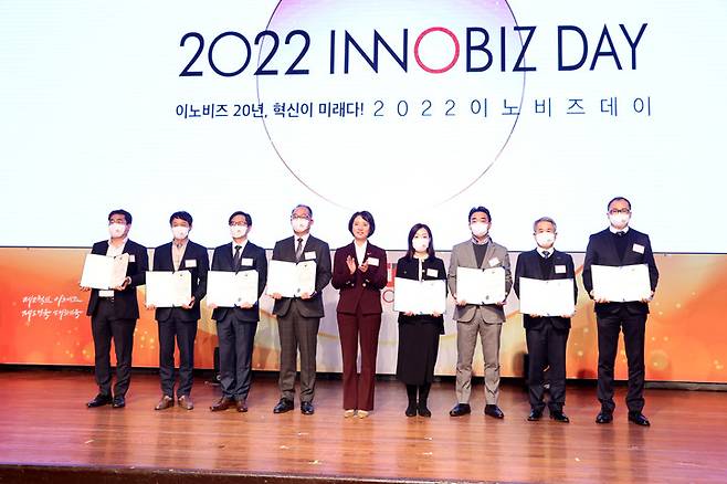 [서울=뉴시스] 추상철 기자 = 이영 중소벤처기업부 장관이 6일 서울 서초구 더케이호텔에서 열린 2022 이노비즈데이에서 우수 기술혁신 유공자에게 표창을 수여하고 기념촬영을 하고 있다. (사진= 중소벤처기업부 제공) 2022.12.06. photo@newsis.com *재판매 및 DB 금지