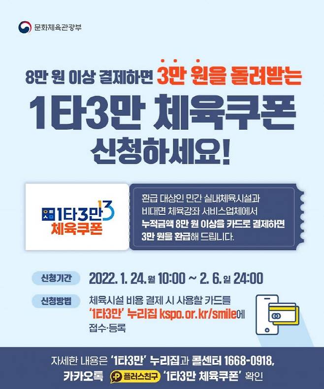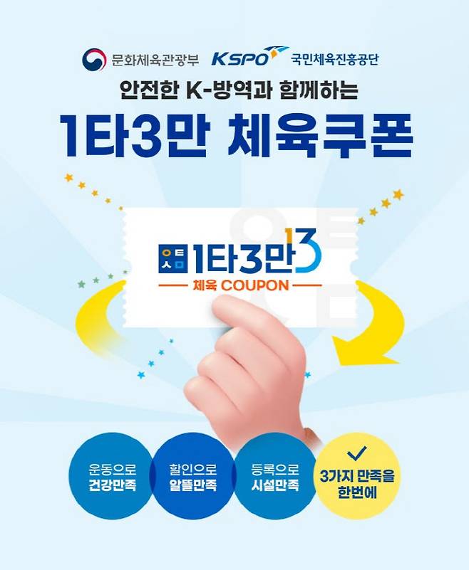 1타3만 체육쿠폰 사업은 코로나19 사회적 거리두기에 따른 영업제한으로 경영난을 겪고 있는 민간체육시설의 이용을 활성화하기 위한 사업으로, 실내 민간체육시설에 8만원 이상 카드 사용시 1인 최대 3만원 환급하는 사업이다.
