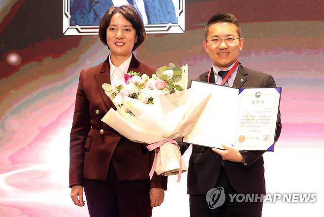 (서울=연합뉴스) 이영 중소벤처기업부 장관(왼쪽)이 6일 서울 서초구 엘타워에서 열린 '2022년 벤처기업인의 밤'에서 이대환 럭스로보 대표이사에게 기업인 부문 올해의 벤처상을 수여한 뒤 기념촬영을 하고 있다. 2022.12.6 [중소벤처기업부 제공. 재판매 및 DB금지]