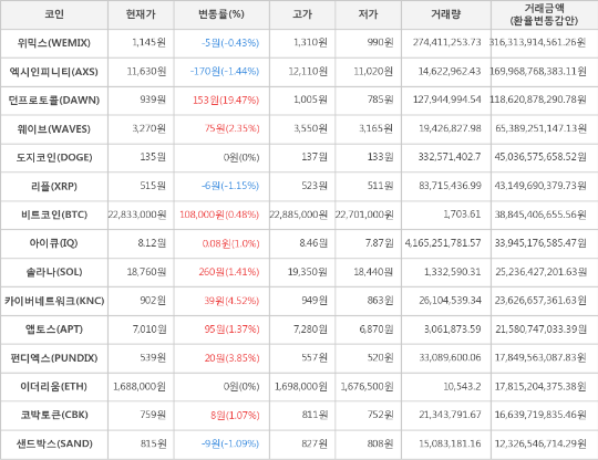 또한, 리플(-1.15%, 515원), 샌드박스(-1.09%, 815원), 위믹스(-0.43%, 1,145원)가 하락세를 나타냈다.
