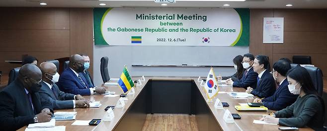 [서울=뉴시스] 추상철 기자 = 남성현 산림청장이 6일 서울 영등포구 여의도 산림비전센터에서 미카엘 무싸 아다모 가봉 외교장관, 리 제임스 테일러 화이트 가봉 산림해양환경장관과 '한-가봉, 기후변화 대응 산림분야 협력'에 대해 논의하고 있다. (사진= 산림청 제공) 2022.12.06. photo@newsis.com *재판매 및 DB 금지