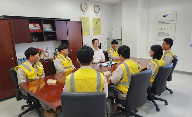 [서울=뉴시스] 추상철 기자 = 이재용 삼성전자 회장이 6일(현지시간) 삼성물산 참여하는 UAE 바라카 원전 프로젝트 건설 현장을 방문해 직원들과 대화하고 있다. (사진= 삼성전자 제공) 2022.12.06. photo@newsis.com *재판매 및 DB 금지