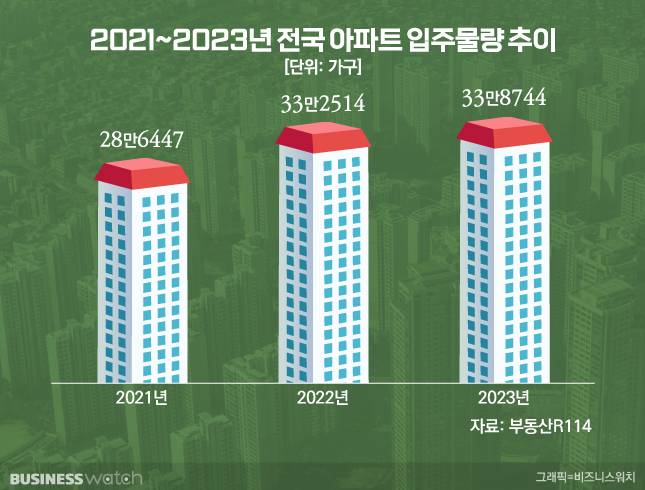 여기에 '입주 폭탄'까지 앞두고 있어 적체된 물량 해소가 시급한 상황이다. 부동산R114에 따르면 전국 아파트 입주 물량은 △2021년 28만6447가구 △2022년 33만2514가구 △2023년엔 33만8744가구 등으로 매년 늘어나는 추세다.
