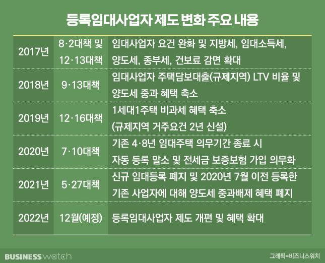 등록임대사업자 제도는 박근혜 정부인 2014년 '주택 임대차시장 선진화방안'을 통해 혜택이 확대된 이후 문재인 정권 초 집값 상승세를 막기 위해 각종 인센티브가 추가 확대됐다.