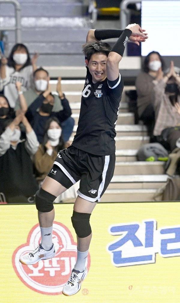 7일 천안 유관순체육관에서 열린 ‘2022~2023 도드람 V-리그’ 남자부 현대캐피탈과 삼성화재 경기에서 현대캐피탈 이시우가 3세트 결정적인 서브 득점에 성공한 후 기뻐하고 있다.