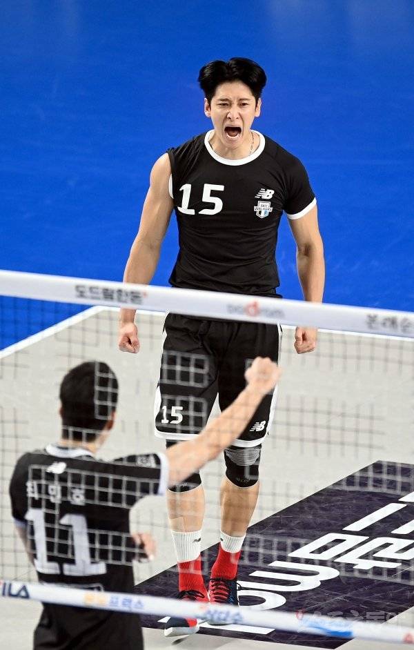 7일 천안 유관순체육관에서 열린 ‘2022~2023 도드람 V-리그’ 남자부 현대캐피탈과 삼성화재 경기에서 현대캐피탈 문성민이 서브 득점에 성공한 후 기뻐하고 있다.