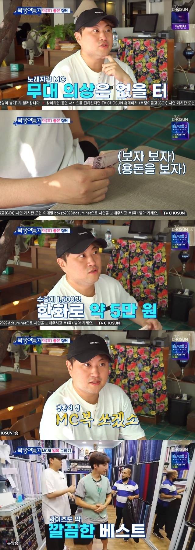 이후 허경환과 함께 거리고 나선 김호중은 "어제 말씀드렸지 않냐. 형 저 때문에 방콕까지 왔는데 뭐하나 드리지 못하고…"라면서 무대 의상 선물을 하고 싶은 마음을 내비쳤다. 이에 허경환은 거부하며 이내 "아니 돈으로 줘"라고 해 웃음을 자아냈다. 김호중은 이후 허경환에게 태국에선 큰 돈 3만 원을 들여 옷 선물을 하는 데 성공했다. (사진=TV조선 '복덩이들고(GO)' 캡처)