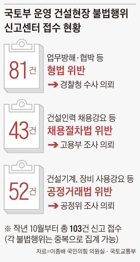 민노총 건설노조는 공사 현장에서 집회를 열고 일부러 소음을 내 인근 주민들이 건설사에 ‘못살겠다’고 민원을 넣게 하고, 건설 현장에서 며칠째 장송곡을 틀기도 한다. 현장 입구에 동전을 떨어뜨린 뒤 노조원들이 이를 줍고 다니며 자재 트럭이 못 들어가게 하는 수법도 썼다. 이런 식으로 공사 현장을 사실상 마비시켜 자기들 요구를 관철한다.