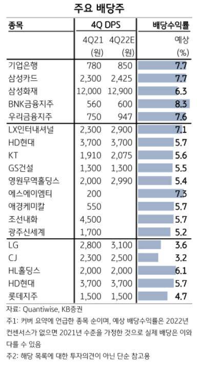 김민규 KB증권 연구원은 “금융주는 배당 성향을, 비금융주는 주당배당금(DPS)을 유지하려는 경향이 강하다”며 “금융주는 이익과 배당 성향을 낮게 고려해도 예상배당수익률이 높은 종목을 고르고, 비금융주는 DPS를 줄인 전력이 적은 종목을 골라야 한다”고 조언했다.