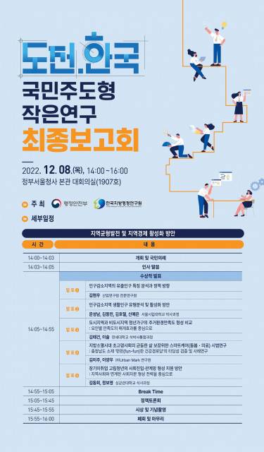 한국지방행정연구원(원장 김일재)은 12월 8일(목)에 정부서울청사 대회의실에서 행정안전부와 공동으로 2022년 ‘도전.한국: 국민주도형 작은연구’ 공모전 최종보고회를 개최한다고 밝혔다.