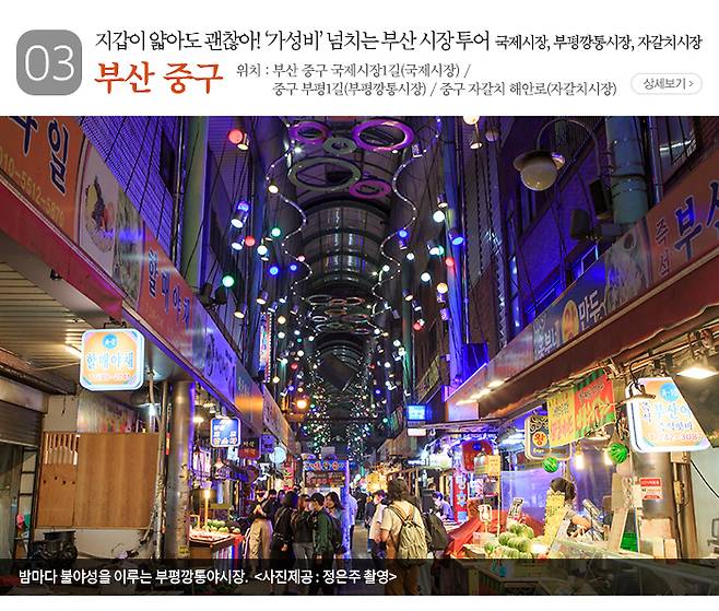 얇은 지갑 때문에 여행이 망설여진다면? 부산으로 알뜰한 시장 여행을 떠나보자. 1만 원이면 배를 든든히 채우고 쇼핑까지 즐길 수 있다. 국제시장은 이름처럼 없는 게 없고, 각종 생필품부터 주방 기구, 철물, 조명, 원단, 부자재, 인테리어 소품 등 다양한 물품을 취급해 구경하는 재미가 쏠쏠하다. 영화 〈국제시장〉을 촬영한 ‘꽃분이네’, 값싸고 푸짐한 한 끼를 맛보는 실비거리도 빠짐없이 들르자.