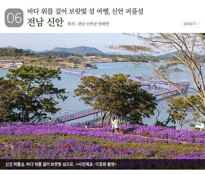 섬 관광을 생략하고 보행교만 따라 걸어도 족히 30분은 걸린다. 푸른 하늘과 바다를 충분히 즐기려면 만조에 맞춰 가는 것이 좋다. 간조에는 보행교 아래로 찰랑이는 물살 대신 너른 갯벌이 펼쳐진다. 섬에 아기자기한 포토 존과 해안일주도로가 조성됐고, 마을호텔과 식당도 있다. 퍼플섬에 갈 때는 보라색을 꼭 기억하자. 보라색 옷이나 신발, 모자 등을 착용하면 입장료(어른 5000원, 청소년 3000원, 어린이 1000원)가 면제된다.