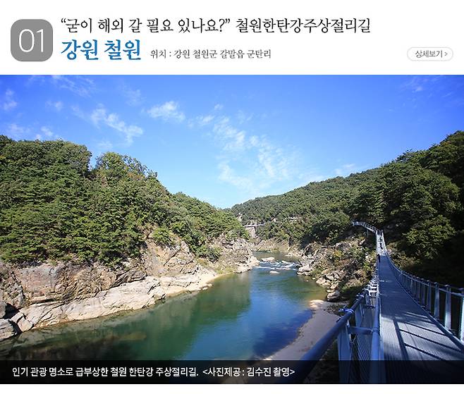 해외 명소 부럽지 않은 비경과 짜릿함을 선사하는 철원한탄강주상절리길이 높은 인기를 얻고 있다. 유네스코가 인증한 한탄강지질공원 순담-드르니 구간에 조성된 길로, 총 길이 3.6km에 이른다. 잔도(높은 절벽에 낸 길)를 거닐며 화산활동이 만든 한탄강 일대의 독특한 지형을 감상한다. 교량 13개, 스카이전망대 3곳, 전망쉼터 10곳을 설치해 전망과 아슬아슬한 재미를 만끽하고, 각자 체력에 맞게 걷기와 휴식을 조절하도록 했다.