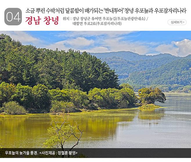 여행은 정보의 조합으로 완성된다. 언제, 어디로, 어떻게 갈까부터 무엇을 먹고, 어디서 잘 것인가까지. 요즘 같은 고물가 시대에는 똑똑한 할인 정보도 빼놓을 수 없다. 세상에 공짜는 없다지만, 모르는 말씀이다. 조금만 관심을 가지면 알찬 정보가 곳곳에 있다. 경남 창녕군도 그런 곳 중 하나. 우포늪은 ‘짠내투어’ 첫 번째 방문지로 맞춤한 장소다. ‘람사르협약에 등재된 국내 최대 규모의 내륙 습지’라는 타이틀 하나로 우포늪의 가치는 충분히 증명된다.