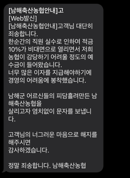 8일 농협중앙회에 따르면 경남 남해의 남해축산농협이 최근 진행한 10%대 적금 특판에 1400억원대의 계약 금액이 몰렸고, 이자비용이 1년 기준으로 대략 70억~80억원대에 달할 것으로 예상됐다. 남해축산농협의 경영공시에 따르면 지난해 이 농협이 이자비용으로 쓴 금액은 8억8300만원 수준이다. 남해축산농협 관계자는 "원래 대면으로 진행했어야 하는 상품인데 실수로 비대면 채널이 열렸다"며 "감당하기 어려울 정도의 예수금이 들어와 경영의 어려움에 봉착했다"고 말했다.