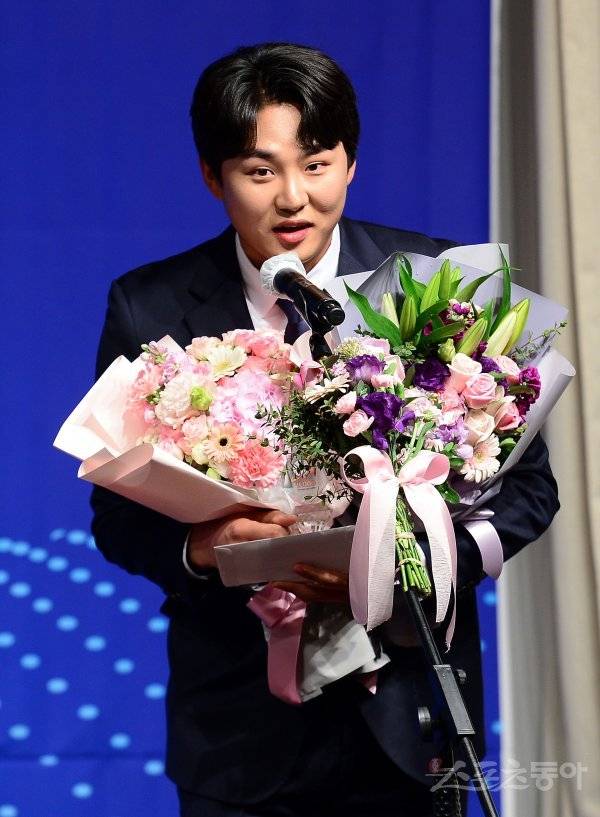 8일 서울 청담동 리베라호텔에서 열린 ‘2022 뉴트리데이 일구상 시상식’에 참석한 두산 정철원이 신인상을 수상 후 소감을 밝히고 있다.
