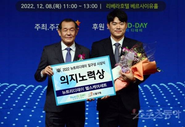 8일 서울 청담동 리베라호텔에서 열린 ‘2022 뉴트리데이 일구상 시상식’에 참석한 SSG 노경은이 의지노력상을 수상 후 박철순과 기념촬영을 하고 있다.