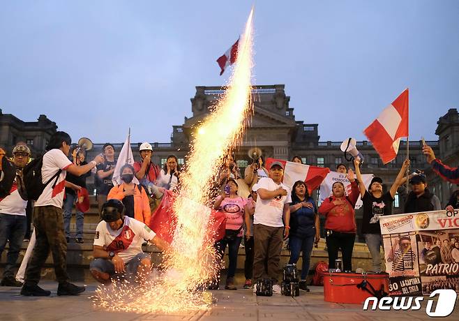 (리마 로이터=뉴스1) 정윤미 기자 = 7일(현지시간) 페루 의회가 페드로 카스티요 대통령 탄핵소추안을 가결하자 수도 리마에서 시민들이 불꽃에 불을 지피고 국기를 흔들고 있다. 2022.12.07