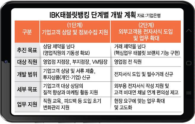 고객 요구를 반영하는 측면도 있다. 개인, 개인사업자의 대면 업무는 감소하지만 법인 기업 여신(대출) 업무는 여전히 대면 절차를 밟아야 하는 실정이다. 고객 확인이나 정보 동의를 위한 종이 약정, 현장실사, 신뢰 구축 등 대면 과정이 필수로 요구된다. 특히 기업고객은 방문 영업 방식을 긍정적으로 생각하며 방문 현장에서 대출한도 및 금리 안내 서비스가 함께 제공되기를 희망하는 경향이 있다. 따라서 실시간 상담과 업무처리가 가능한 디지털 마케팅 도구를 바탕으로 현장에서 상담부터 가입을 끝낼 수 있는 고객 관리 툴이 필요했다. 기업은행은 클라우드 기반으로 태블릿 뱅킹을 구축하고 이를 위한 시스템, 네트워크, 솔루션, 애플리케이션(앱) 등을 개발키로 했다.