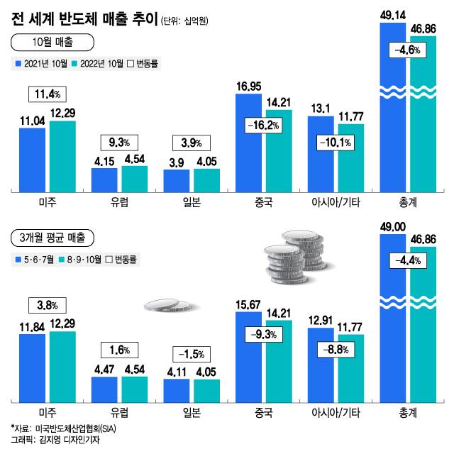 8일 미국반도체산업협회에 따르면 지난 10월 세계 반도체 산업 매출은 지난해 동기 대비 4.6% 감소한 469억달러를 기록했다. 2019년 12월 이후 가장 큰 비율의 감소 폭이다. 올해 추이로 보면 심각성은 더해진다. 최근 3개월(8·9·10월)간 평균 매출은 이전(5·6·7월) 대비 4.4% 줄어든 것으로 나타났다. 하반기는 성수기라는 공식이 깨지는 것은 물론 역행하는 모습이다.