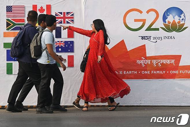 (뭄바이 AFP=뉴스1) 김성식 기자 = 8일(현지시간) 인도 뭄바이에서 학생들이 2023 주요 20개국(G20) 정상회의를 알리는 광고판 앞을 지나가고 있다. 광고판에는 내년 G20 주제인 '하나의 지구·하나의 가족·하나의 미래'와 함께 주요국 국기가 그려져 있다. 지난 1일 G20 의장국이 된 인도는 내년 9월 뉴델리에서 G20을 개최한다. 2022.12.8.