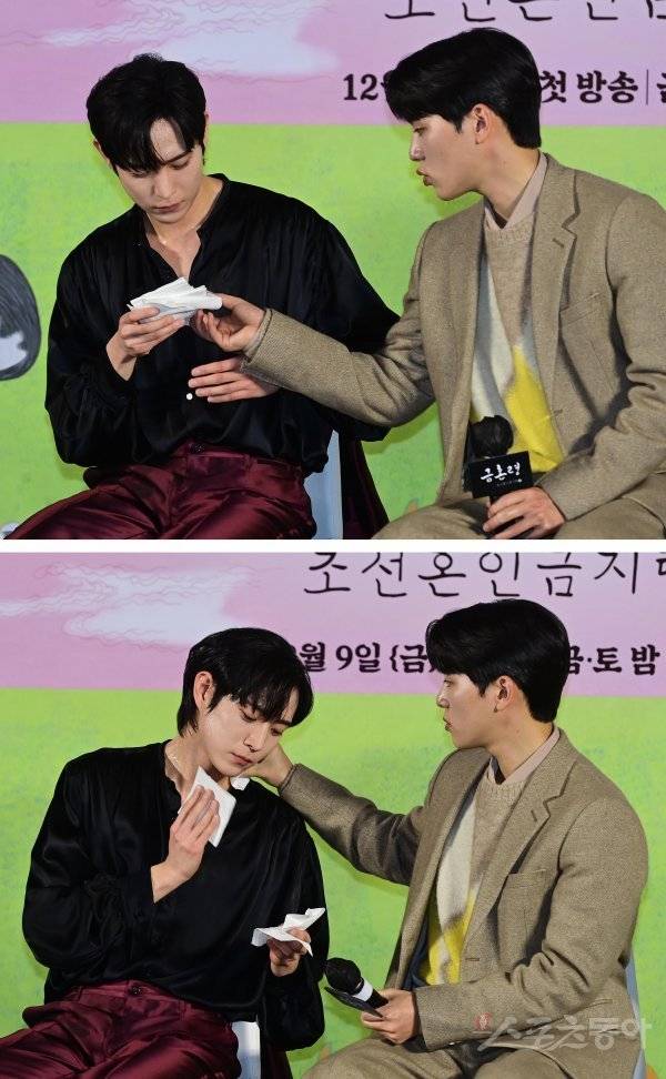 배우 김우석이 8일 서울 용산구 CGV용산아이파크몰점에서 열린 MBC 새 금토드라마 ‘금혼령, 조선 혼인 금지령’ 제작발표회에서 김영대의 땀을 닦아주고 있다.