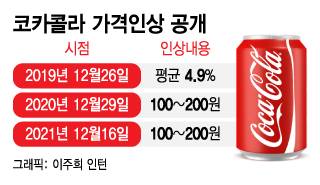 코카콜라는 지난해와 지지난해 편의점 캔음료와 페트(PET) 가격을 각각 100~200원 올렸다. 2019년에는 코카콜라 250㎖캔 제품과 500㎖ 페트 제품 등을 비슷한 수준인 4.9% 인상했다.