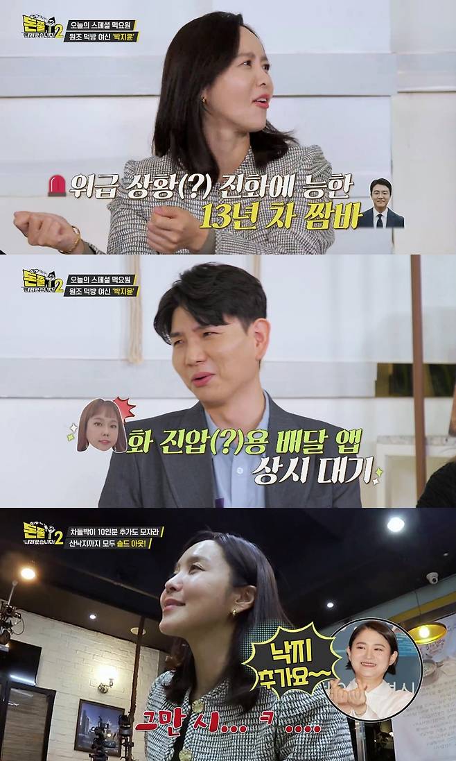 박지윤은 "예전에는 '배부르다'를 모르고 먹었다"며 과거 활약을 언급했고 자신이 예민해질 때마다 남편(최동석)이 먹을 것을 찾는다고 해 폭소를 유발했다.