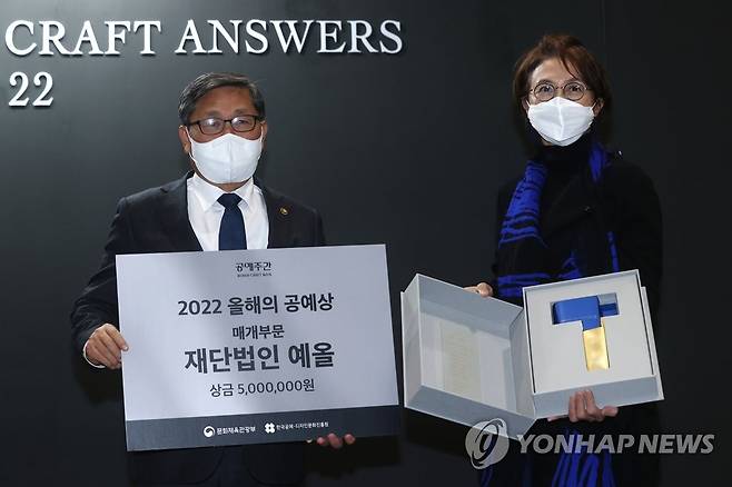 (서울=연합뉴스) 진연수 기자 = 8일 오후 서울 강남구 코엑스에서 열린 '2022 공예트렌드페어' 개막식에서 올해의 공예상 매개부문을 수상한 예올의 김영명 이사장(오른쪽)과 전병극 문화체육관광부 제1차관이 기념촬영을 하고 있다. 2022.12.8