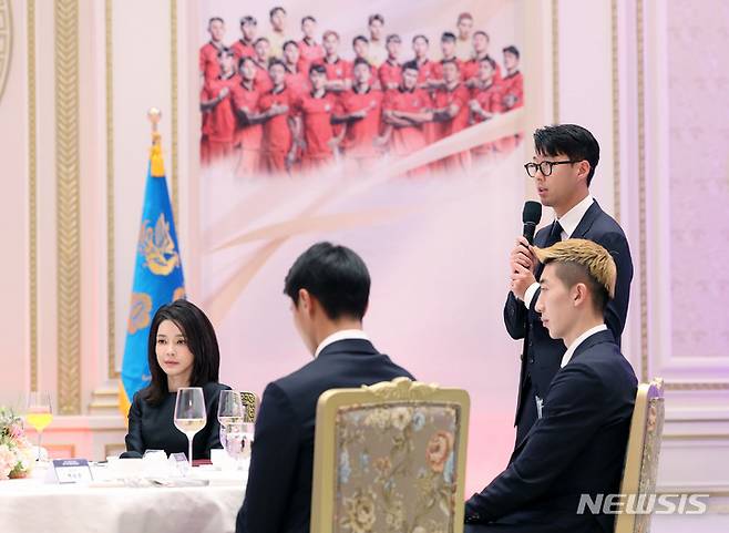[서울=뉴시스] 홍효식 기자 = 카타르 월드컵 축구 국가대표팀 주장 손흥민 선수가 8일 청와대 영빈관에서 열린 카타르 월드컵 축구 국가대표팀 환영 만찬에서 답사하고 있다. (대통령실통신사진기자단) 2022.12.08. yesphoto@newsis.com