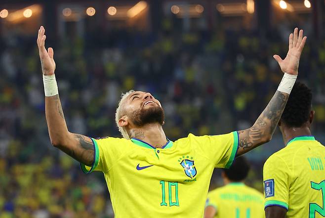 | ▲ 6일(한국시간) 카타르 도하 974스타디움에서 열린 2022 카타르 월드컵 16강전 대한민국과 브라질의 경기. 부상에서 복귀한 네이마르가 페널티킥을 성공한 뒤 환호하고 있다 |
