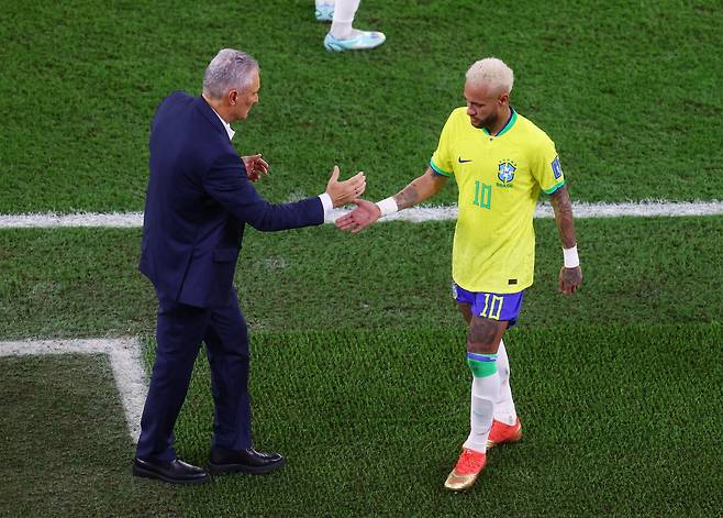 | ▲ 브라질 축구 국가대표팀의 네이마르(오른쪽·30)가 5일(현지시간) 카타르 도하의 974 스타디움에서 열린 2022 카타르 월드컵 한국과의 경기 후반 35분에 교체돼 나오면서 감독 치치(61)에게 환영받고 있다. 지난달 24일 열린 조별리그 G조 세르비아전에서 발목을 다친 네이마르는 이날 페널티 킥으로 득점하며 브라질의 4-1 승리에 힘을 보탰다. |