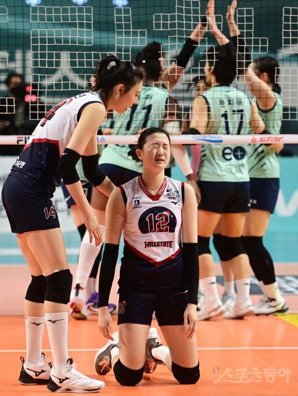 8일 서울 장충체육관에서 열린 ‘2022-2023 도드람 V-리그’ 여자부 서울 GS칼텍스와 수원 현대건설의 경기에서 범실한 현대건설 이다현이 아쉬워하고 있다.