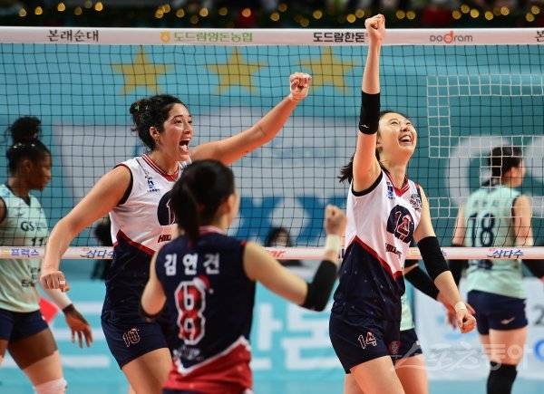 8일 서울 장충체육관에서 열린 ‘2022-2023 도드람 V-리그’ 여자부 서울 GS칼텍스와 수원 현대건설의 경기에서 득점에 성공한 현대건설 야스민과 양효진이 세리머니를 하고 있다.