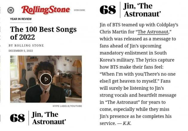 올해 전 세계를 사로잡은 100개의 명곡 리스트 중 진이 발표한 솔로곡 'The Astronaut'(디 애스트로넛)은 68위에 이름을 올리며 한국 솔로이스트 중 최고 순위를 기록했다.
