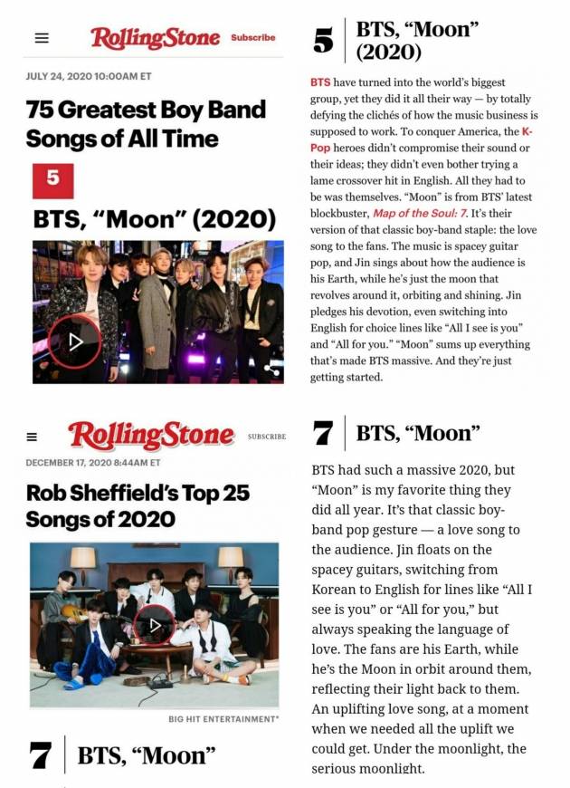 롤링스톤은 '2020 베스트 앨범 50'(The 50 Best Albums of 2020)에 방탄소년단의 'MAP OF THE SOUL : 7'을 선정하며 "가장 좋았던 부분은 청중을 향한 진의 놀라운 사랑 노래인 'Moon'이다. 기타 선율 위에 팬들을 위해 헌신하고자 하는 그의 약속을 담았다"라며 'Moon'이 앨범의 하이포인트라고 극찬 받았다.