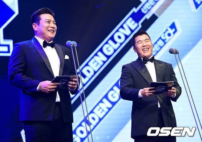 시상자로 나선 전 프로야구 선수 김태균과 정근우가 미소짓고 있다. 2022.12.09 / dreamer@osen.co.kr